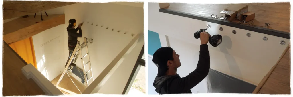 L’un des défis majeurs : fixer solidement le filet, y compris sur le mur en tuffeau recouvert de placo.