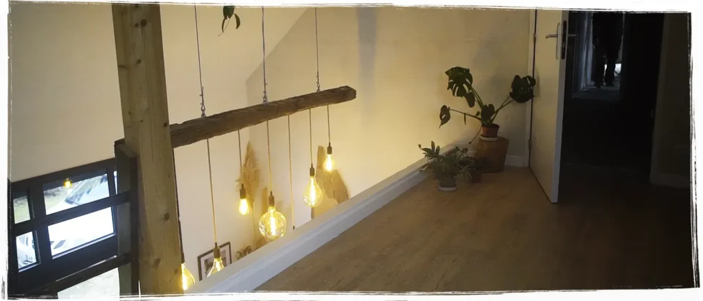 Aux Rosiers-sur-Loire, sur une mezzanine à sécuriser, j’ai conçu un garde-corps métallique sur mesure à base de fers à béton et de cornières, alliant design industriel, robustesse et intégration esthétique avec le reste de la pièce.